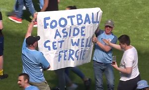 Перед вручением кубка чемпионов АПЛ, болельщики #Манчестер Сити вышли на поле с баннером в поддержку Сэра Алекса: "В сторону футбол. Выздоравливай, Ферги!"