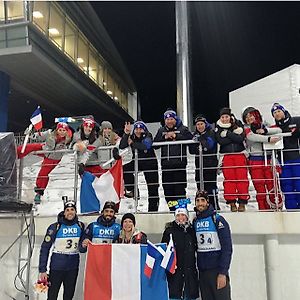 #Симон Дестье, #Симон Фуркад и #Мартен Фуркад со своими французскими фанатами. #сборная Франции #Кубок мира