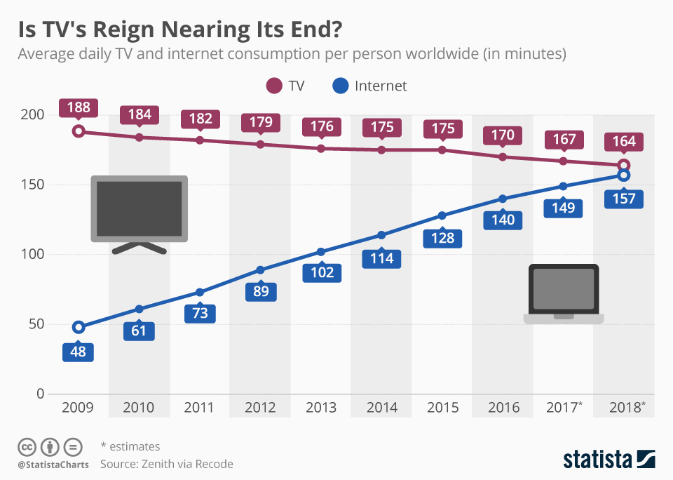 Среднее (по миру) время с интернетом и с телевидением – в минутах в день. Практически сравнялись.