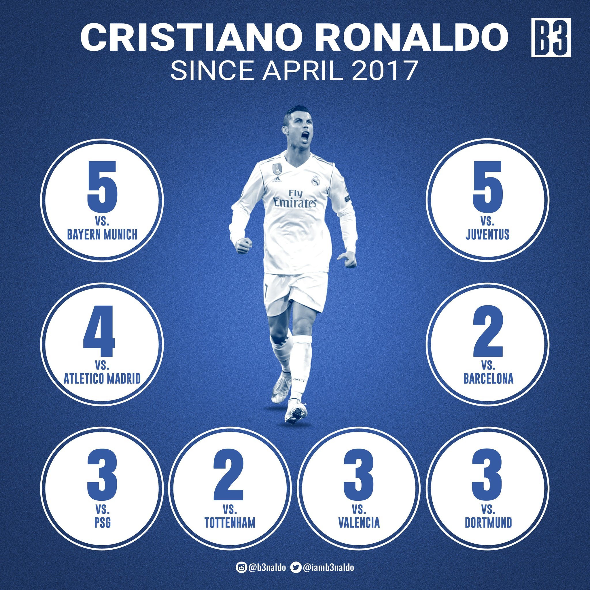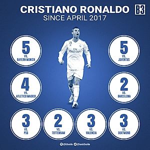 Количество голов Криштиану Роналду в ворота больших клубов с апреля 2017 года.