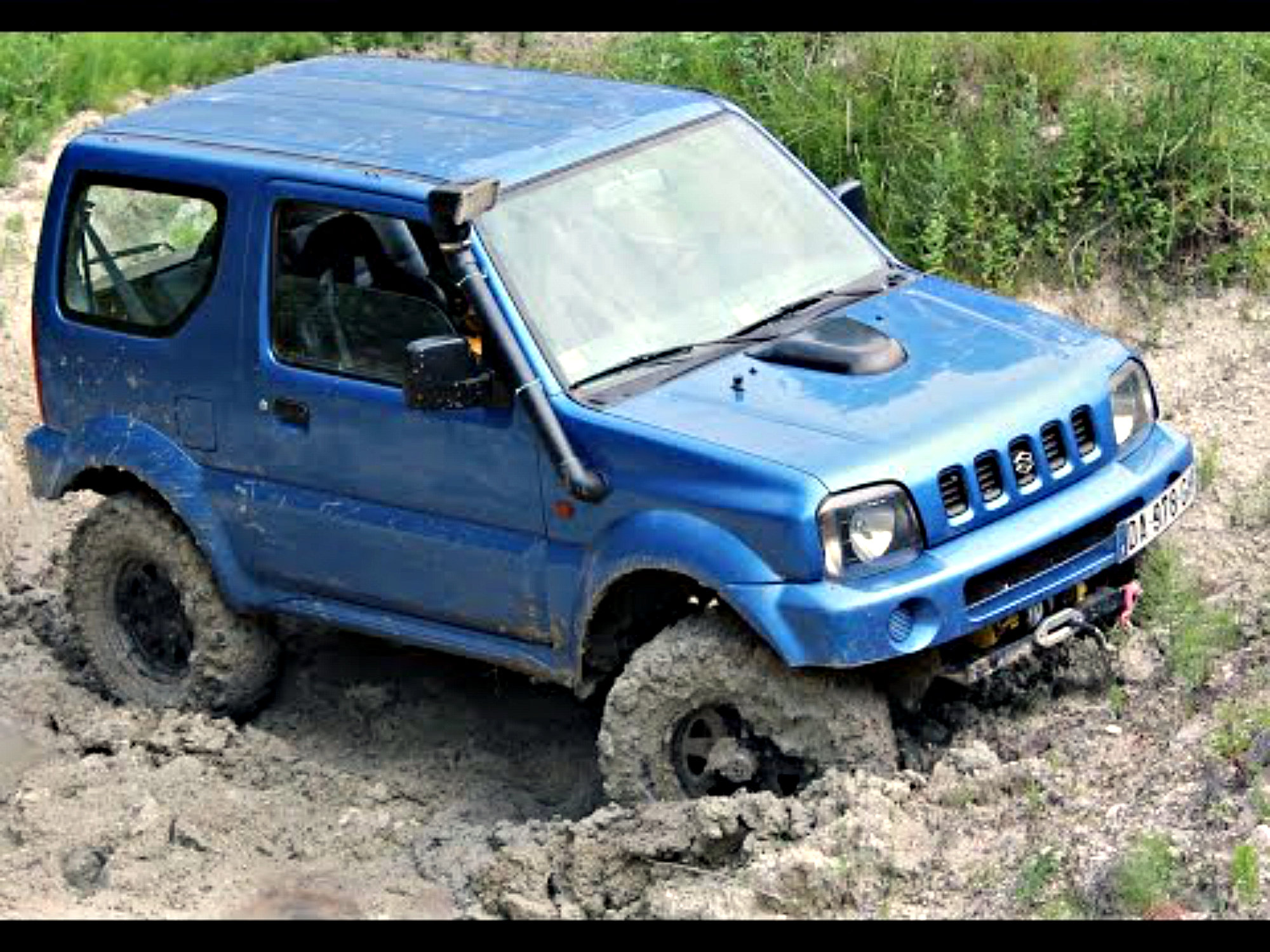 Брат одел резиновые сапоги и прошелся по колее, которая была не далеко от застрявшей машины и решил, что дно этой колеи пригодно для проезда на моей машине. Я, сильно не газуя, на 4ВДЛ пониженной передаче потихоньку сунулся в эту впадину с грязью.Дно оказалось довольно мягкое и глинистое, так что колеса Джимни без твердой опоры стали буксовать.