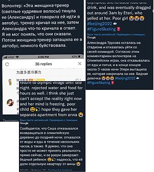 — Нет, Этери Георгиевны не было. Я сдавала допинг, но быстро. Вышла на улицу в 00:41, а он уехал в 00:40. После этого они час не могли найти транспорт, чтобы я могла уехать. Я просто час ждала автобус одна. ... Читать дальше Волонтеры ходили искали машину. Они разговаривали на китайском, поэтому я уходила на каток за интернетом, чтобы воспользоваться переводчиком. Через час нашли мне машину.