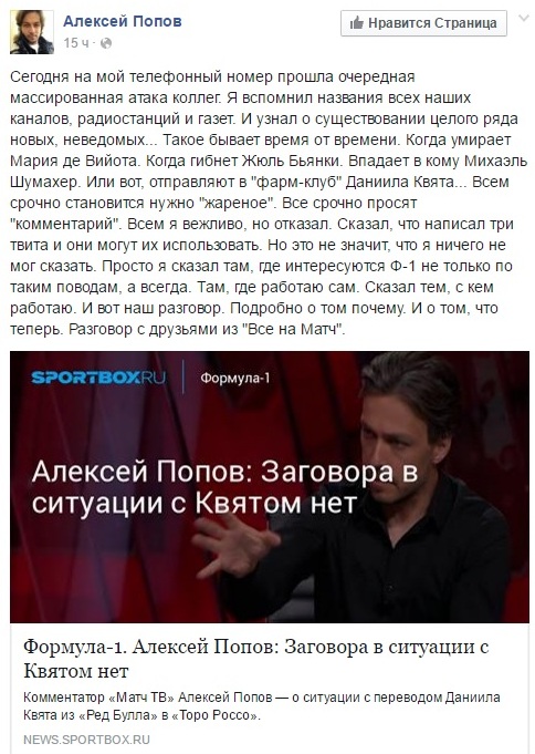 Вчера был один из редких моментов, когда формула зацепила многих: талантливого пилота из России жестко и, может быть, несправедливо вытолкали из элитной команды. Новости о #Даниил Квят весь день ... Читать дальше душили геополитику и курсы валют в топе Яндекса. В авторазделах всех спортивных сайтов вдруг стало тесно – раздел Авто/мото на Sports.ru пережил, видимо, рекордный всплеск.