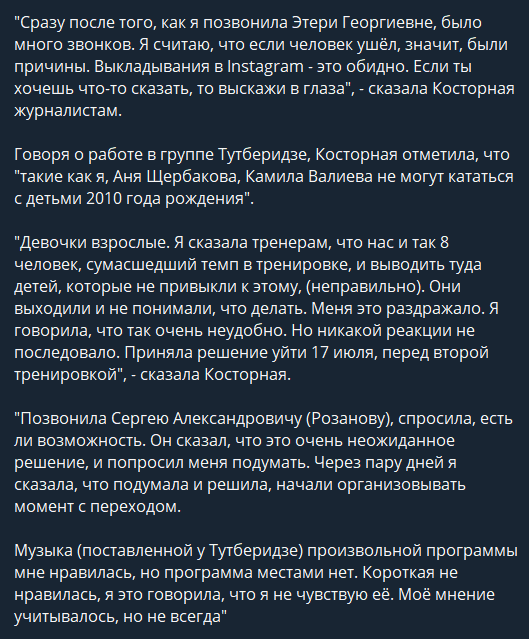 косторная давала интервью японскому шоу недавно. говорит, песню под которую она хотела кататься, тутберидзе отдала другой девочке. взбесилась