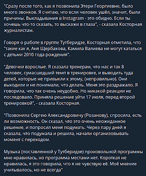 и предисловие "Каждый способен выводы сделать сам, как относилась Этери Георгиевна к Саше Трусовой.У меня лишь один вопрос к Саше и ее родителям...Вам не стыдно?" -- ну это просто лолище. кому как не безликому пользователю судить с дивана о взаимоотношениях двух людей на экране.