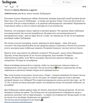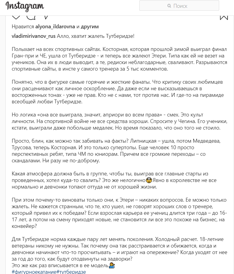 "Для меня удивительно, что столько людей любят этот спорт [фигурное катание]. Спорт, культивирующий детский труд, мужские истерики и какую-то запредельного уровня необъективность"