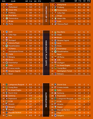 Две турнирных таблицы Лиги Европы. Старая правая (предыдущего тура) и левая (только что сыграли). Слева - положение команд в Лиге Европы после последнего 5-го тура. Справа - положение команд после предыдущего 4-го тура.
