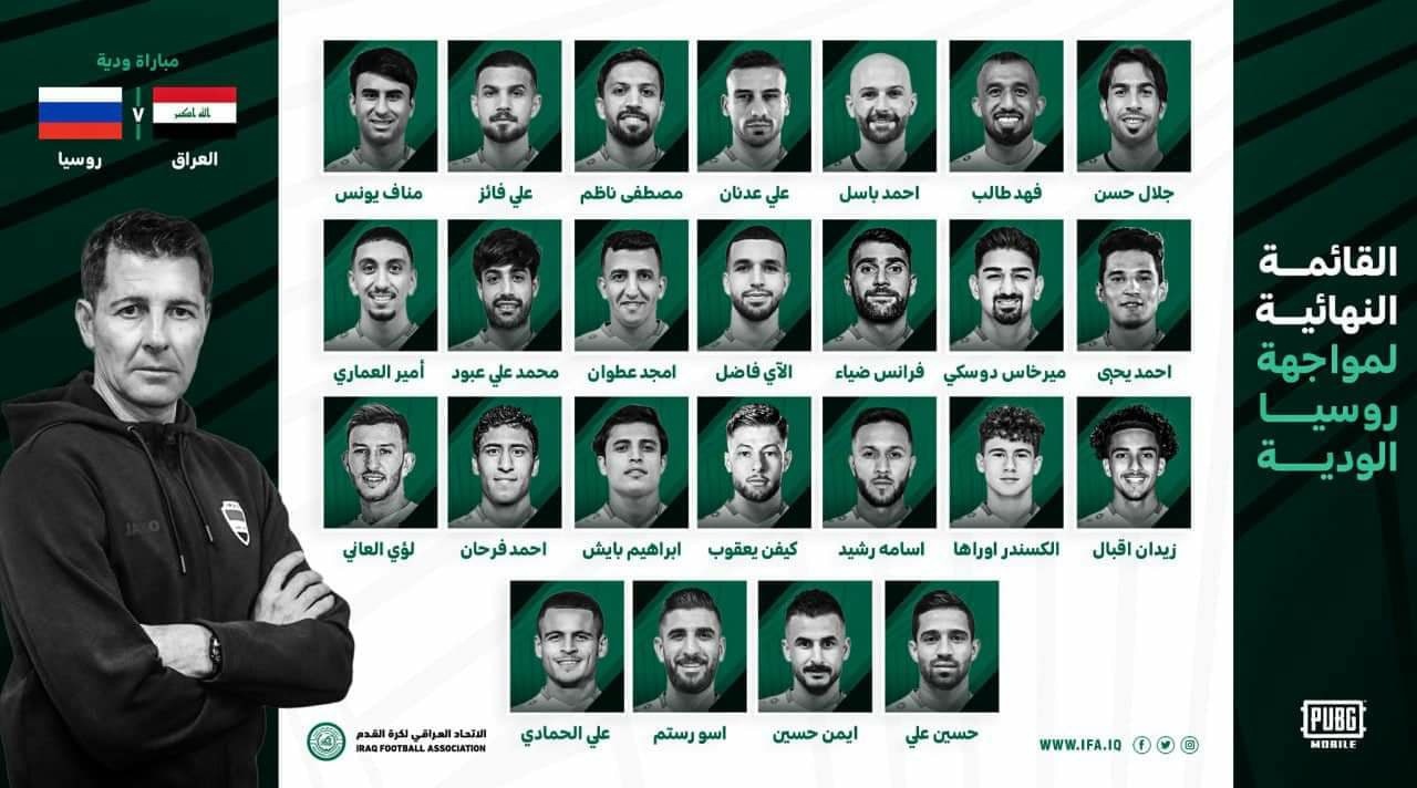 Тренерский штаб сборной Ирака во главе испанцем Хесусом Касасом назвал состав национальной команды на матч с Россией: 1. Али Аднан «Рубин» (Казань/Россия). 2.