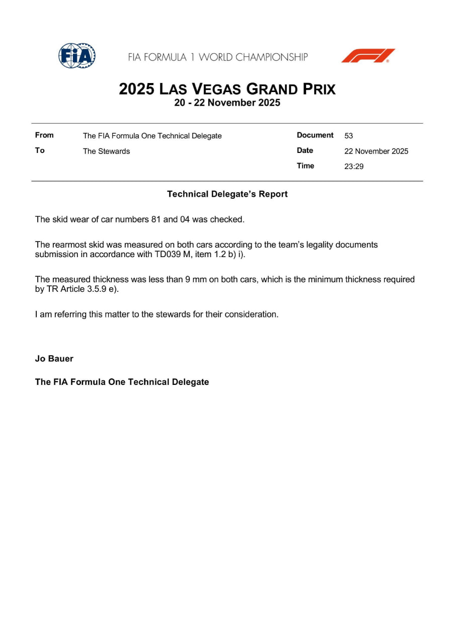 Норрис и Пиастри могут быть дисквалифицированы на Гран-при Лас-Вегаса из-за возможного излишне сильного износа нижней планки