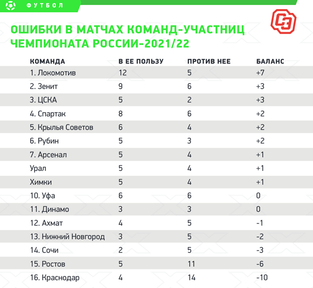 UPD. Правка свежей информации. У Краснодара по итогам первой половины нынешнего сезона согласно СЭ, который по какой-то причине надо брать за абсолют, не +1 в судейских ошибках, а минус 2. Мой косяк, извиняюсь))