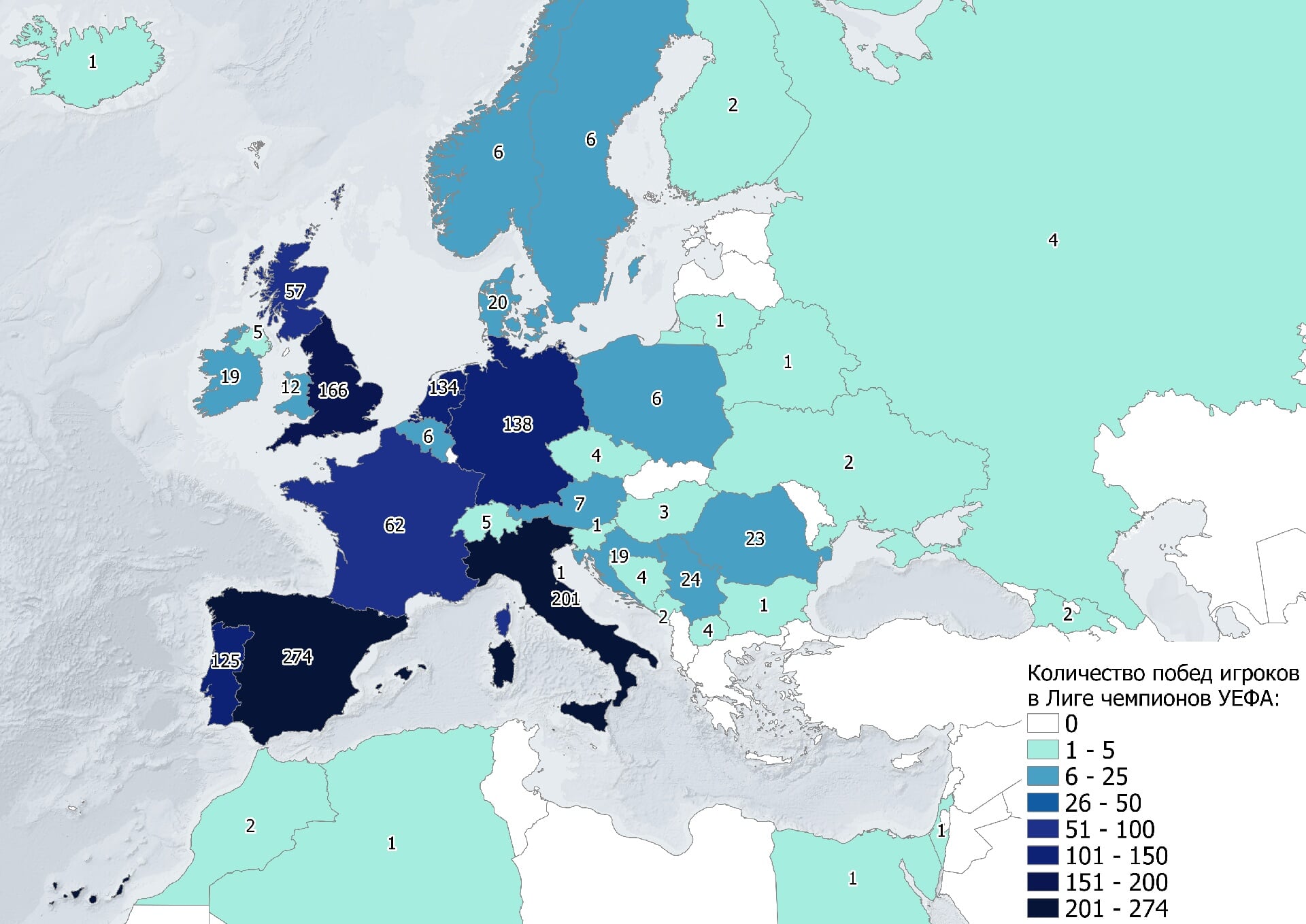 В финале Лиги чемпионов между #Челси и #Манчестер Сити встречаются две английские команды. Но, изучив основные составы финалистов, можно увидеть, что английских игроков не так и много. Всего 10 на оба клуба. Многие ключевые футболисты представляют различные страны: Испанию, Бразилию, Португалию, Германию, Украину и другие. Чтобы выяснить, игроки какой страны чаще всего выигрывали Кубок чемпионов,...Читать дальше начиная с первого розыгрыша в сезоне 1955/56, вне зависимости от того за какой клуб они выступали, мы с коллегами из it-thematic сделали веб-карту на которой визуализировали количество побед игроков из разных стран. Считалась каждая победа, даже если игрок выигрывал Кубок несколько раз. Итоги получились следующие: Больше всего побед в Лиге чемпионов УЕФА (Кубке европейских чемпионов) у игроков из Испании – 274. На втором месте Италия – 201. На третьем Англия – 166. Больше всего побед игроков из не европейских стран у Бразилии – 78. Более полную информацию вы можете посмотреть, перейдя по ссылке (статья на Яндекс.Дзен): zen.me/1Zrt8Xx1 #Лига чемпионов УЕФА#история