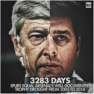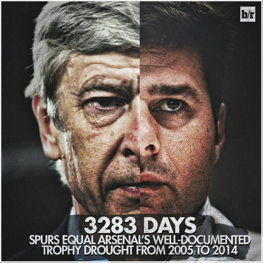 3283 дня. Ровно столько длится текущая бестрофейная засуха #Тоттенхэма. Засуха #Арсенала длилась столько же с 2005 года и была прервана в 2014, благодаря завоёванному Кубку Англии