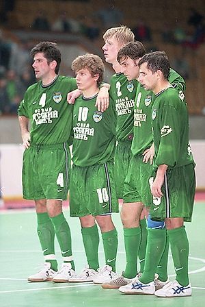 Обратите внимание в какой обуви играл. Это самые офигительные кеды для миника. Фирма "Эксис" (Москва) Москва. В них и сейчас олдскульщики играют, мужики кто шарит и за брендами не гонится. У нас в Екатеринбурге только в одном месте продают: в ларьке на стадионе "Урала". У меня такие, кстати... эх... давно я их не расчехлял Урал