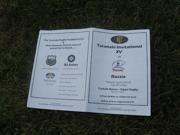 Первый контрольный матч (из двух запланированных) наша команда проводила в Вайтаре, что в 16 км от Нью-Плимута. Соперник – сборная провинции Таранаки. Команда – средняя по новозеландским меркам. Стадион, который больше напоминал пикник, заполнился в течение часа. Более 1000 человек приехало, набежало, а потом еще и осталось на третий (а по сути, четвертый) тайм. К матчу специально изготовили программку и нашили российские флаги. Приехали мэр города и посол России в Новой Зеландии – все серьезно. По взаимной договоренности было сыграно три тайма по 30 минут.