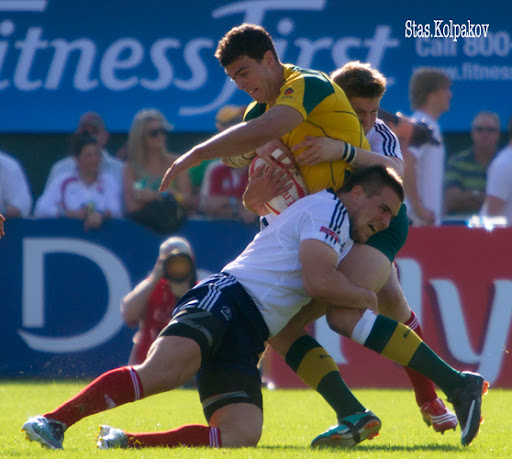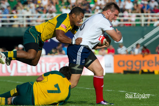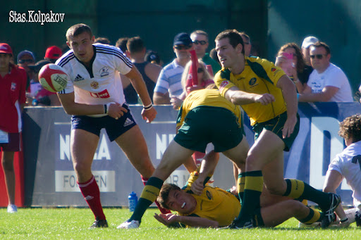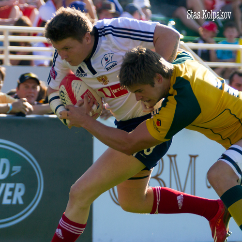Игра против носителей славных традиций и золотистых регбиек тоже получилась вполне упорной: сборная Австралии достаточно уверенно вышла вперед (14:5), однако наша команда показала, что тоже не лыком шита. "Южанин" Владимир Остроушко, за плечами которого не один международный турнир высочайшего уровня, положил попытку, а Дмитрий Перов добавил реализацию - и вот уже 14:12. Увы - в дальнейшем дюжие ребята из страны кенгуру контролировали ситуацию. Попытка Юрия Гостюжева и реализация Дмитрия Перова только чуть сократили итоговую разницу в счете - 28:19.