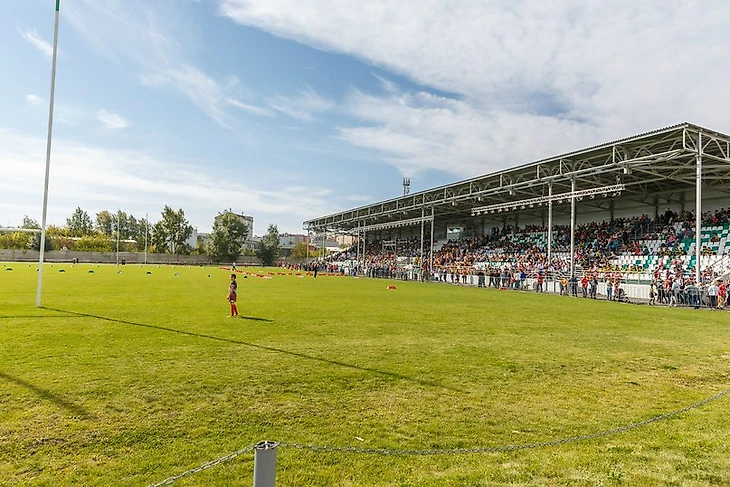 Внутреннее устройство. Да, здесь чисто и просторно, несколько точек питания, столик с атрибутикой и одна аккуратная трибуна. Для зрителей этой трибуны вполне достаточно, аншлага не собрал красный яр даже таким матче, но по регбийным меркам это очень приличный показатель. Туалетного помещения нет, есть 5 биотуалетов. Не самый лучший вариант, но лишь бы было чисто.