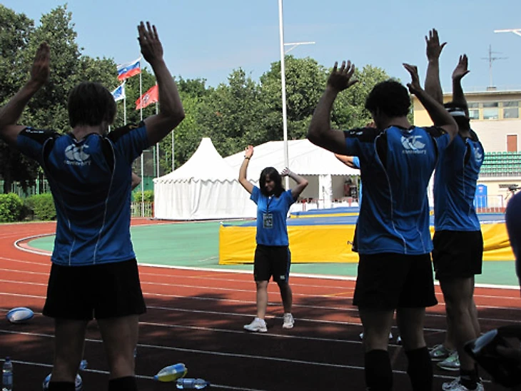 После любого матча сборная России сразу заходила в зачетную зону и принималась выполнять упражнения на растяжку. В этом смысле чемпионат Европы по регби-7 � образец расхлябанности. Идет игра, а посторонние спортсмены сидят на газоне. Это что! На Кубке европейских чемпионов англичане проводили полноценную разминку с мячами во время матчей других команд. Выбирали себе угол поля и бегали, как ни в чем не бывало.