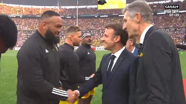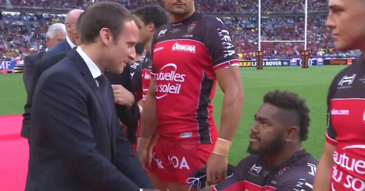 1. 6 лет назад он тоже пришел на финал Топ-14 между «Клермон Овернь» и «Тулоном». Президент по традиции вышел к игрокам – и получил мощное приветствие от фиджийских регбистов. Они встали на колено перед Макроном.