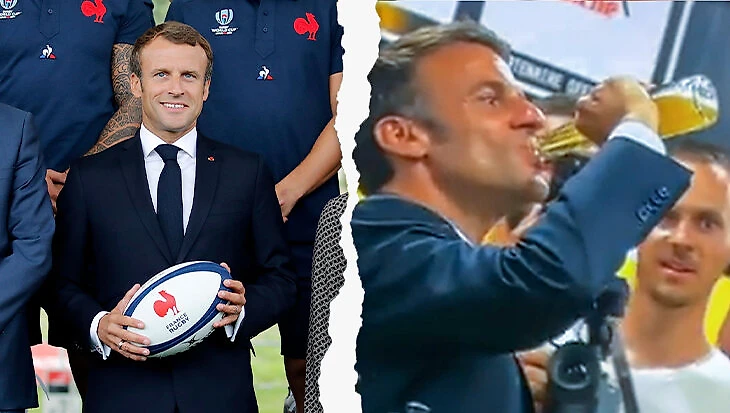 Ого, Эммануэль Макрон выпил бутылку пива за 20 секунд в раздевалке с регбистами!