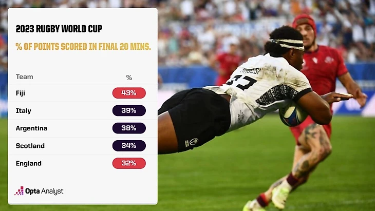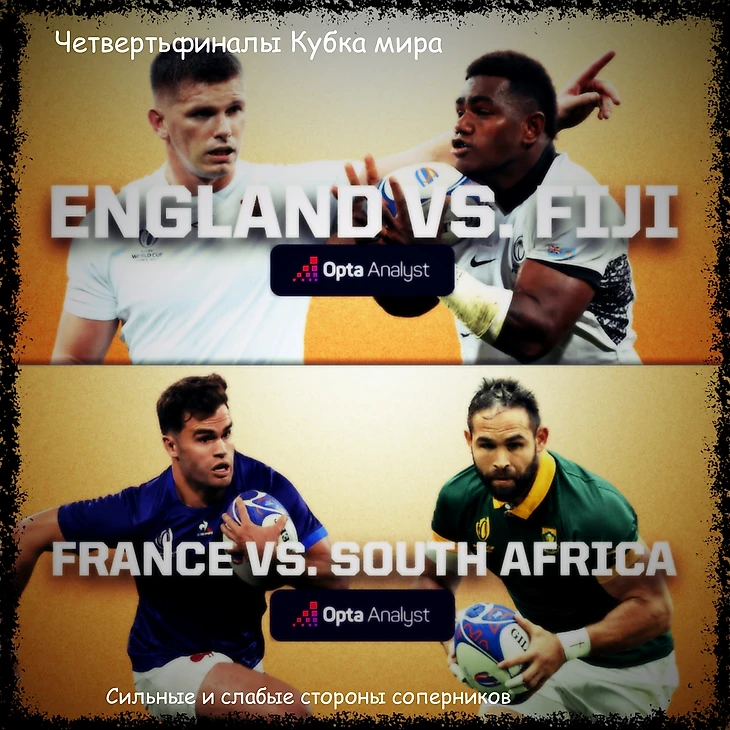 Физическое напряжение, которое свирепая атака Фиджи оказывает на своих соперников, позволило им набрать 43% игровых очков в последней четверти игр, что является самым высоким показателем среди всех команд. Англия также набрала наибольшее количество очков за последние 20 минут матчей (32%) и пропустила всего 18% от общего количества очков в последней четверти, что является самым низким показателем среди всех команд. Таким образом, скорее всего, результат сегодняшнего четвертьфинала не будет ясен до тех пор, пока не прозвучит финальный свисток в Марселе.