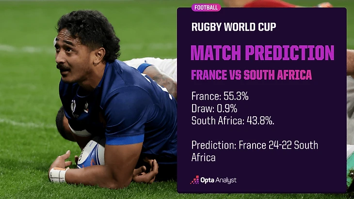 Суперкомпьютер Opta считает, что это будет очень равная игра. Однако Франция больший фаворит, и ей прогнозируют победу с небольшим перевесом в два очка.