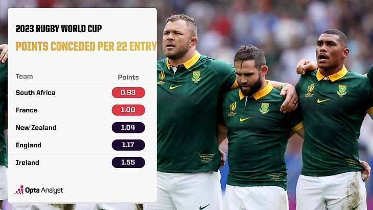Обе команды беспощадны в чужих «22х» , набирая в среднем 3,32 и 3,22 очка за визит в «красную зону» соответственно. Тем не менее, в сегодняшней игре, вероятно, мы увидим среднее снижение этого показателя, поскольку Франция и Южная Африка также являются единственными двумя командами, которые пропускали в среднем очко или меньше за вход соперника в свои 22. В целом, «Спрингбоки» пропустили всего четыре попытки, а Франция пропустила всего пять.