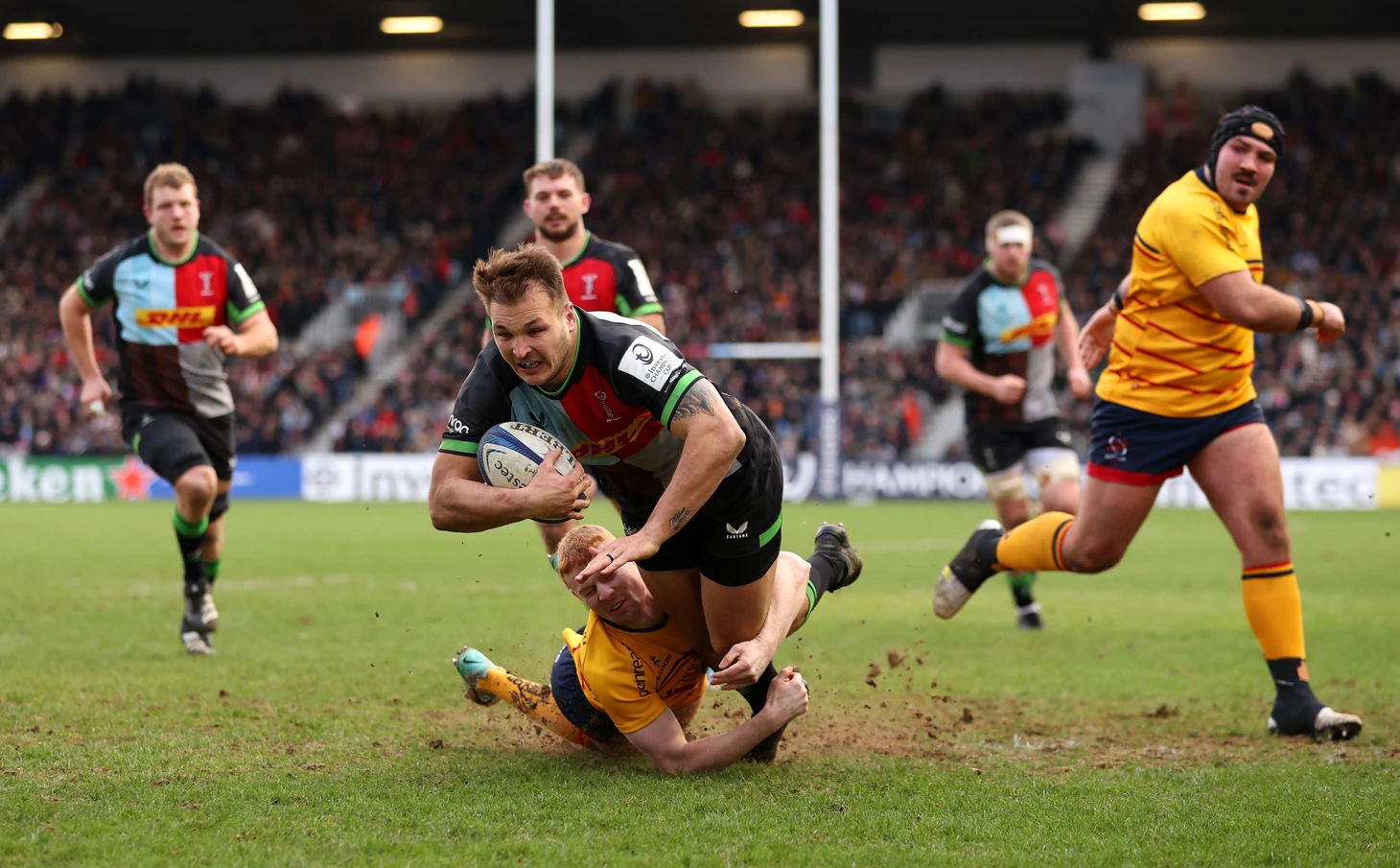 Ник Дэвид открыл счёт на 5-й минуте – защита ирландцев зевнула быстрый розыгрыш аута, и он убежал на зачётку в одиночестве. «Ольстер» пошёл реваншироваться. После атаки в 8 фаз удаляется всё тот же Дэвид. Поначалу «Арлекинс» удавалось отбиваться – хорошо сработал контрмол в их исполнении. Но на 14-й минуте Роберт Балукун прорывается по краю, и после серии передач попытку кладёт Дэвид Маккан.