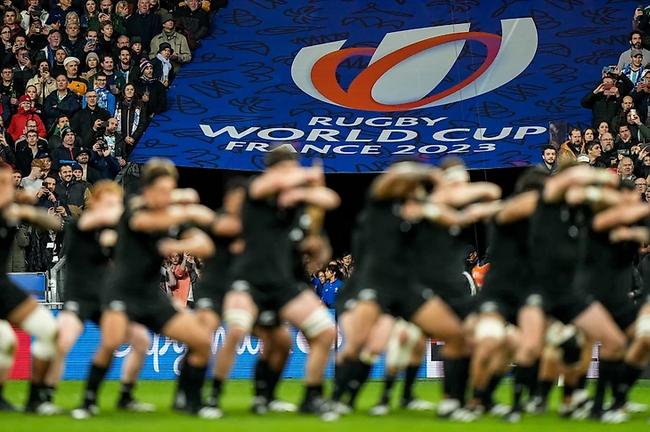 Для нового логотипа выбрана форма, напоминающая символ женского Кубка мира, но с акцентом на динамику и энергию мужского. Впервые вместо полной надписи «Rugby World Cup» на логотипе используется аббревиатура RWC. Такой шаг подчеркивает современный минимализм, однако вызвал дискуссии среди фанатов. Некоторые отмечают, что предыдущий подход с добавлением графических элементов к логотипу был более выразительным, как это было на турнирах в Японии и Франции.