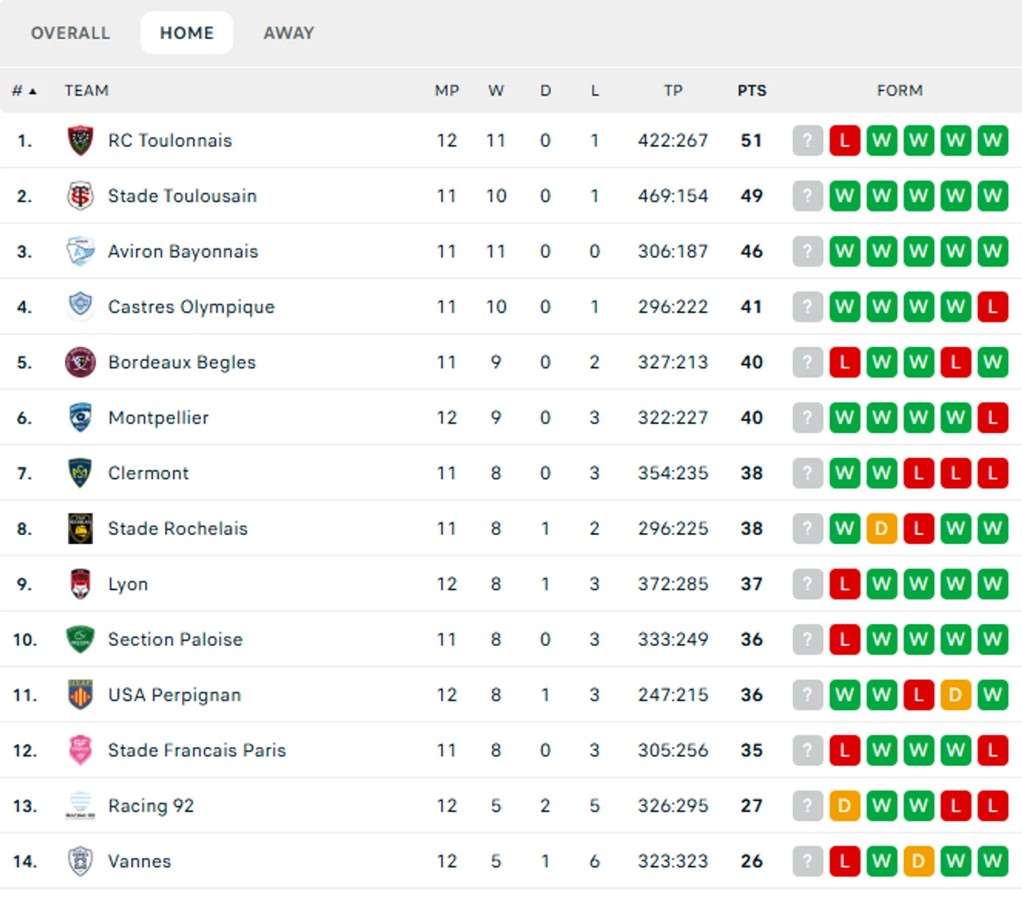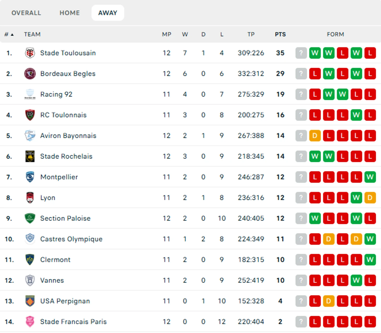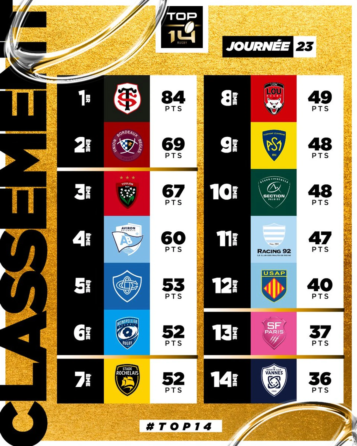 Турнирная таблица TOP 14