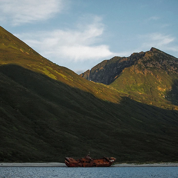 Швартоваться нам не к чему. Коля бросает якорь, спускает тузик, и команда в два захода оказывается на берегу. Крупная тихоокеанская галька, тихоокеанский мусор, брусья и ржавый японский корабль. Выше — полукруг из бархатных зеленых сопок, и кажется, что можно за час-другой оказаться наверху.