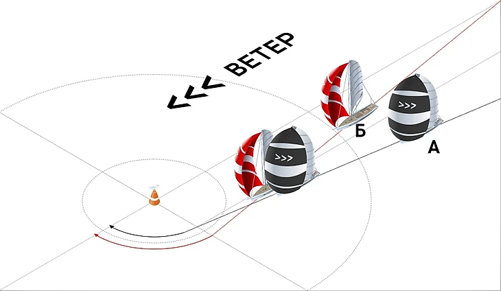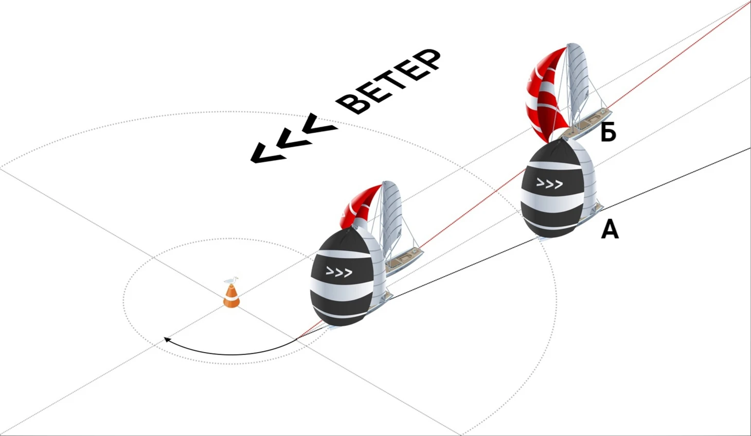 Яхта с черным спинакером (А) имеет право дороги (Яхта имеет право дороги по отношению к другой яхте, если другая яхта обязана сторониться ее) по правилу 10 (Когда яхты находятся на противоположных галсах, то яхта левого галса должна сторониться яхты правого галса.) потому что идет правым галсом. Яхта с красным спинакером (Б) по этому правилу обязана уступать дорогу, то есть сторониться. В это же время яхта Б имеет право на место-у-знака (Место — пространство, необходимое яхте для незамедлительного маневрирования. Место-у-знака — место, необходимое яхте, чтобы оставить знак с предписанного борта. ) по правилу 18.2 (Правило объясняет предоставление места-у-знака в целом, нам же важно такое положение из раздела 18.2: «Когда яхты связаны, то наружная яхта должна дать место-у-знака внутренней яхте». Связаны — значит, не находятся друг за другом.) потому что идет с внутренней стороны.