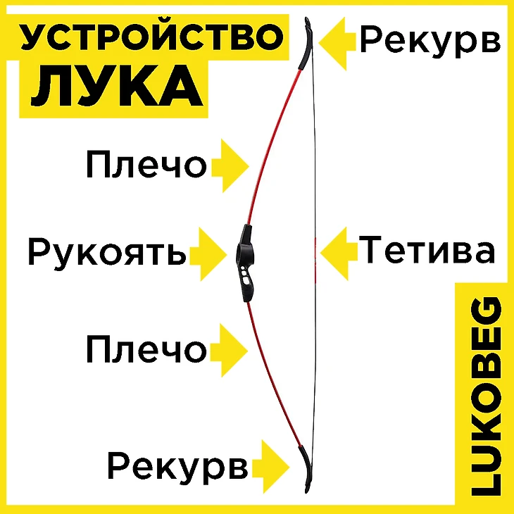 Лук состоит из: рукояти, плечей, рекурвов и тетивы.