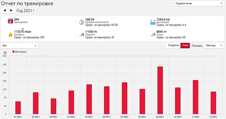 На следующий год мой тренер изменил тренировочный план в пользу велосипеда, и бег остался в плане только в виде разминок и заминок, а также одной-двух контрольных тренировок в месяц. Объемы бега, к моему огромному сожалению, сильно упали, однако выросла средняя скорость. На графике можно увидеть, что среднемесячный объем выровнялся относительно 2020 года. Было обидно проиграть по объему себе из 2020, но зато у меня появилась мотивация поставить себе более высокую цель – 2000 км за год.
