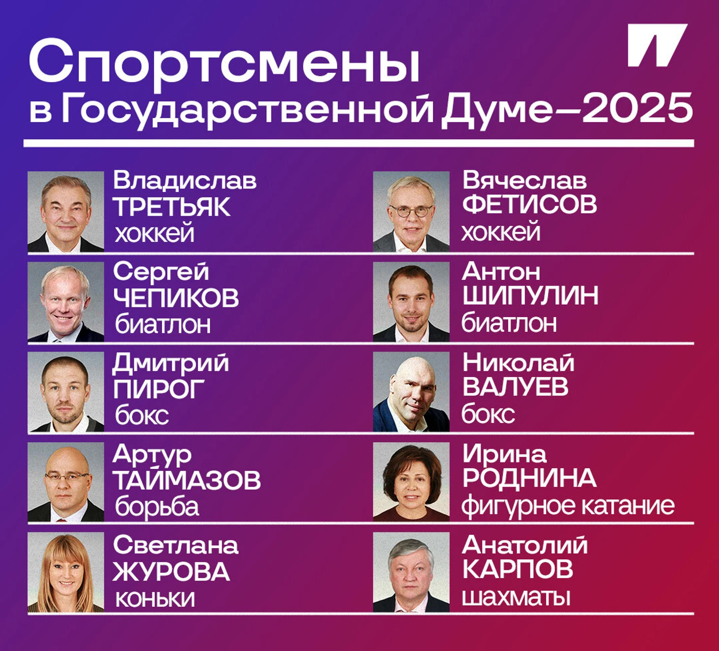 Сейчас в Госдуме 10 больших в прошлом спортсменов: боксеры Николай Валуев и Дмитрий Пирог, борец Артур Таймазов, хоккеисты Вячеслав Фетисов и Владислав Третьяк, биатлонисты Сергей Чепиков и Антон Шипулин, фигуристка Ирина Роднина, конькобежка Светлана Журова и шахматист Анатолий Карпов.