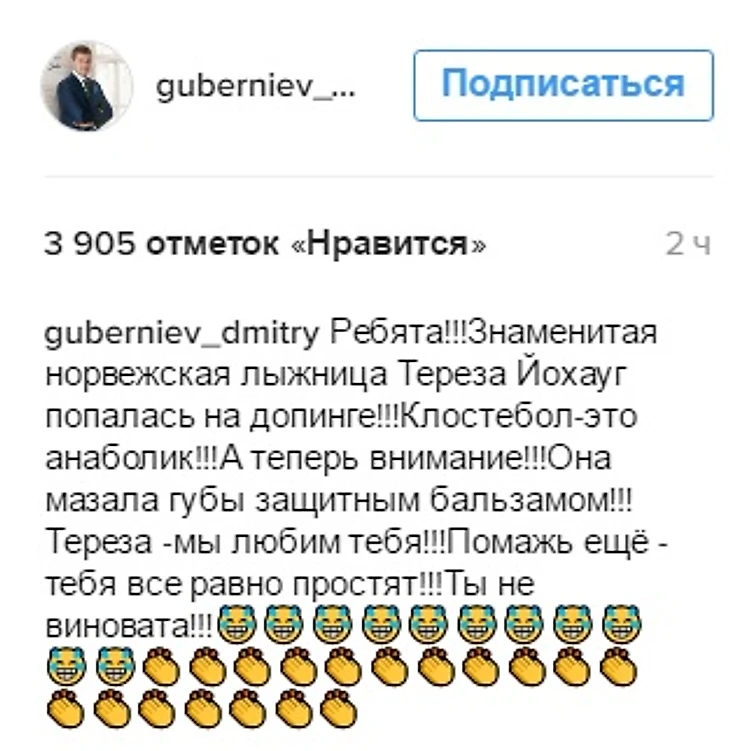 «Ребята!!! Знаменитая норвежская лыжница Тереза Йохауг попалась на допинге!!! Клостебол – это анаболик!!! А теперь внимание! Она мазала губы защитным бальзамом!!! Тереза, мы любим тебя!!! Помажь еще – тебя все равно простят!!! Ты не виновата!» – написал Губерниев.