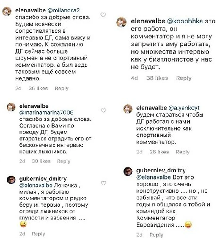 Леночка, милая, я работаю комментатором и редко беру интервью, поэтому огради лыжников от глупости и забвения», – ответил ей Губерниев.