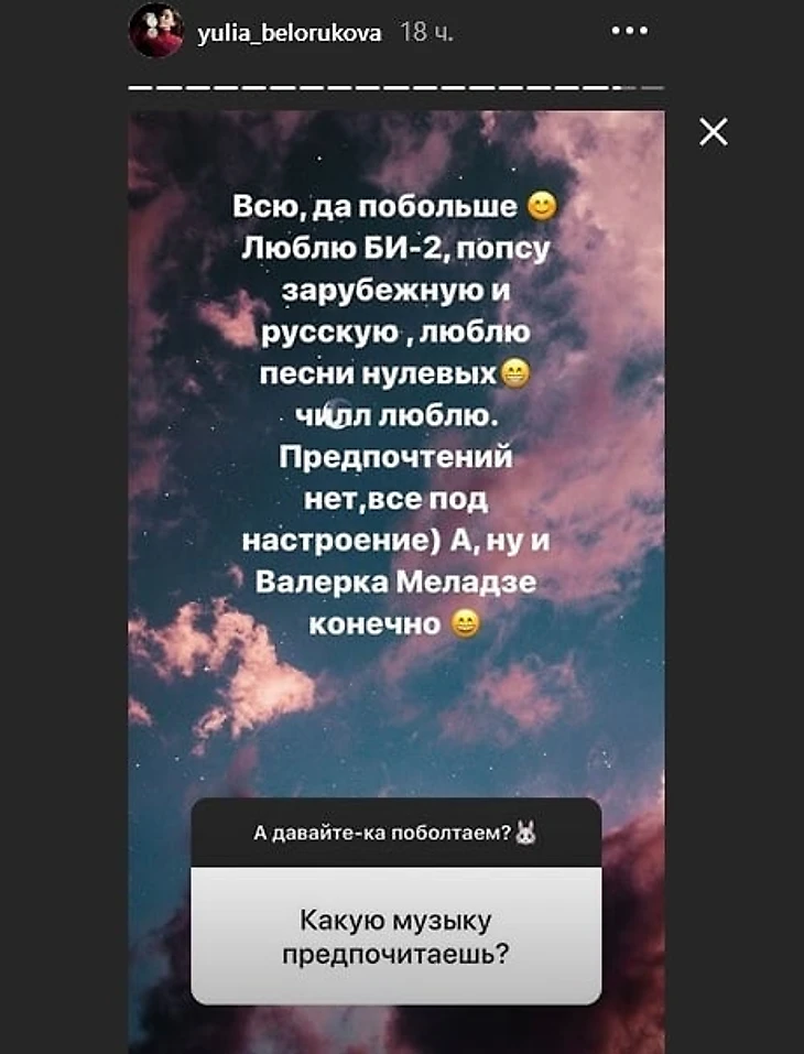 – Все, да побольше. Люблю БИ-2, попсу зарубежную и русскую, люблю песни нулевых, чилл люблю. Предпочтений нет, все под настроение. А, ну и Валерка Меладзе, конечно, – написала Белорукова.