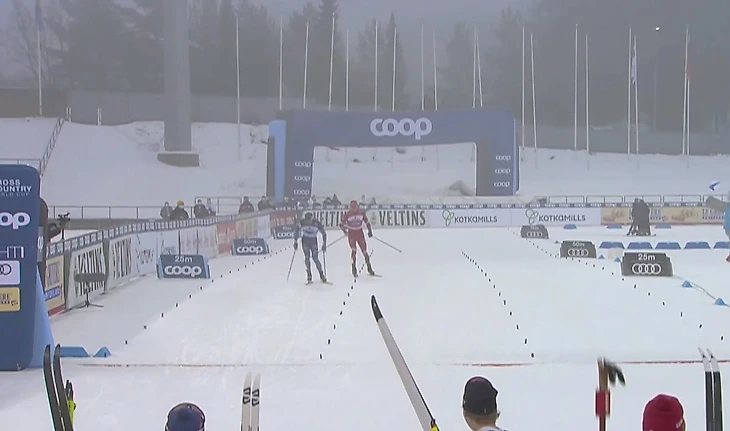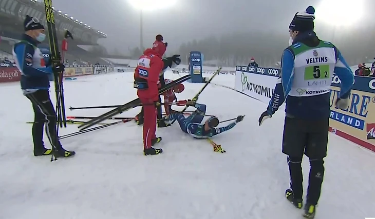 Российский лыжник Александр Большунов врезался в представителя Финляндии Йони Мяки после финиша эстафеты на этапе Кубка мира в Лахти.