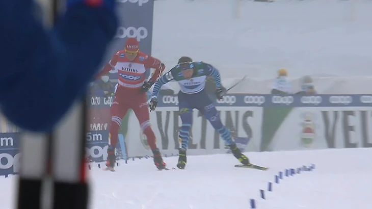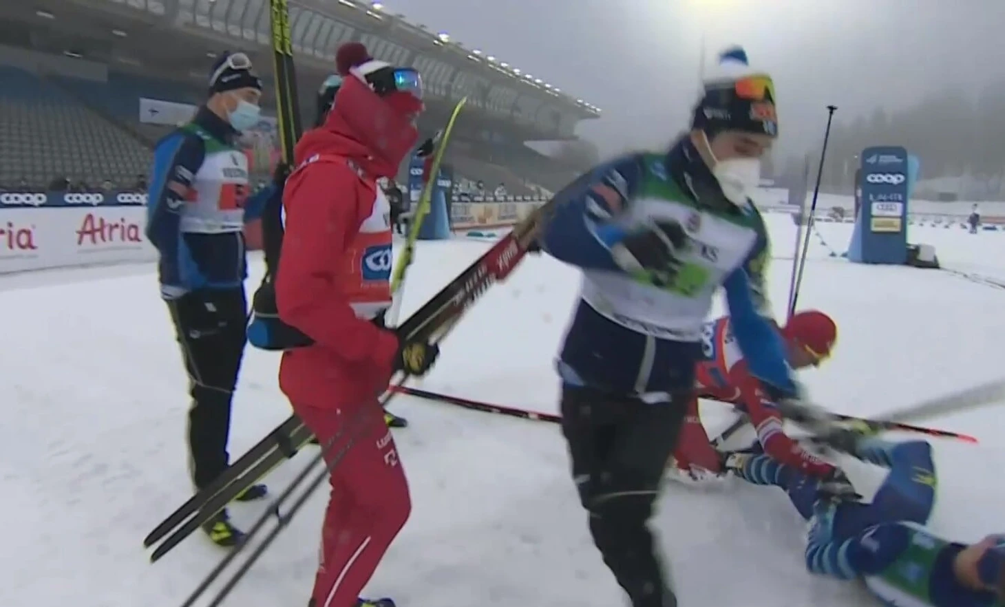 Большунов после финиша врезался в представителя Финляндии Йони Мяки. На последних метрах гонки он замахнулся на финна палкой.