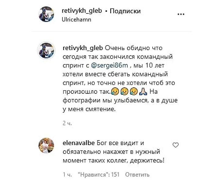 «Бог все видит и обязательно накажет в нужный момент таких коллег, держитесь!» – написала Вяльбе в инстаграме Ретивых.