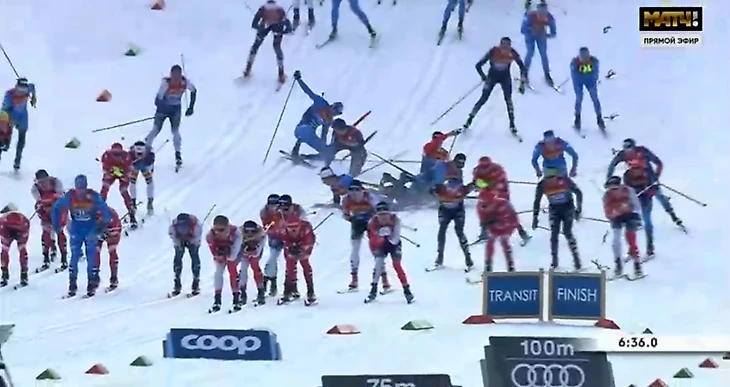 В ходе гонки лыжники устроили массовый завал. Российские спортсмены избежали падений.