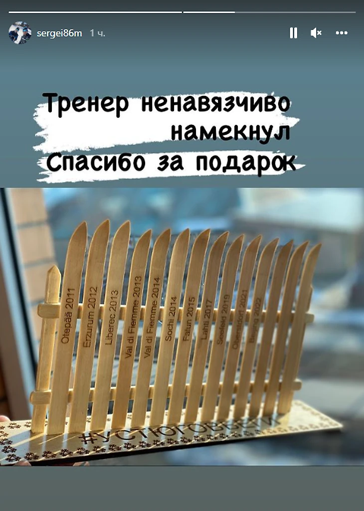 Спортсмен показал в сторис сувенир в виде миниатюрных лыж, на которых отмечены даты и места проведения крупных соревнований с его участием. На сувенире размещен тег #УстюговБеги, а последние три лыжи остались неподписанными.