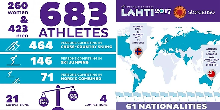 Это будет 7 чемпионат мира по лыжным видам спорта в финском Лахти (ранее в этом месте проводились соревнования в 1926, 1938, 1958, 1978, 1989 и 2001 годах)