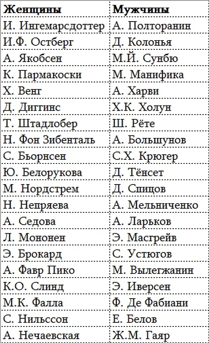 1. Ш. Рёте 1-3. М.Й.Сунбю 1-6. А. Большунов