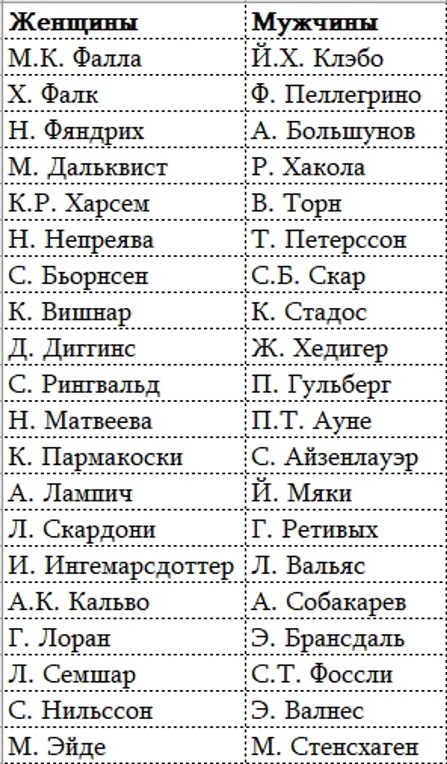 1.Стина «Королева спринта» Нильссон.1-3 М.Далквист 1-6.Н.Непряева