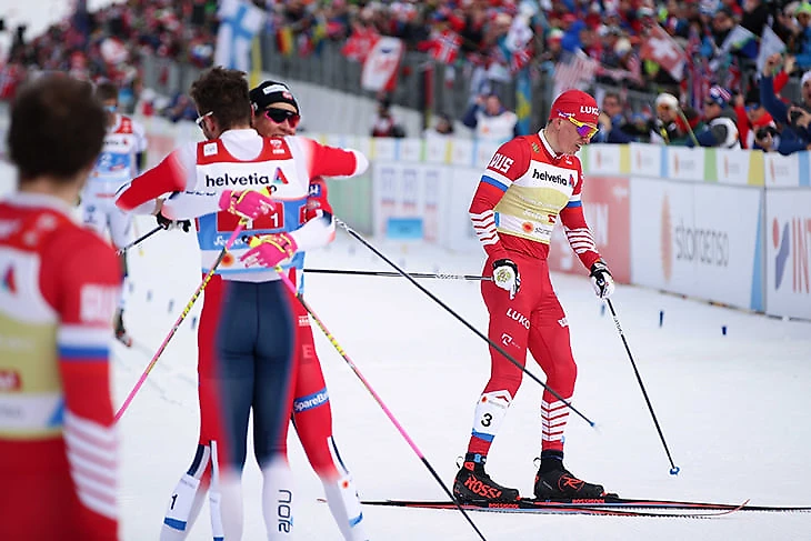 Командный спринт в лыжах – гонка тактиков, особенно на удивительной трассе Зеефельда. Здесь начинать последний спуск первым – проигрышная позиция, и все пропускают друг друга.