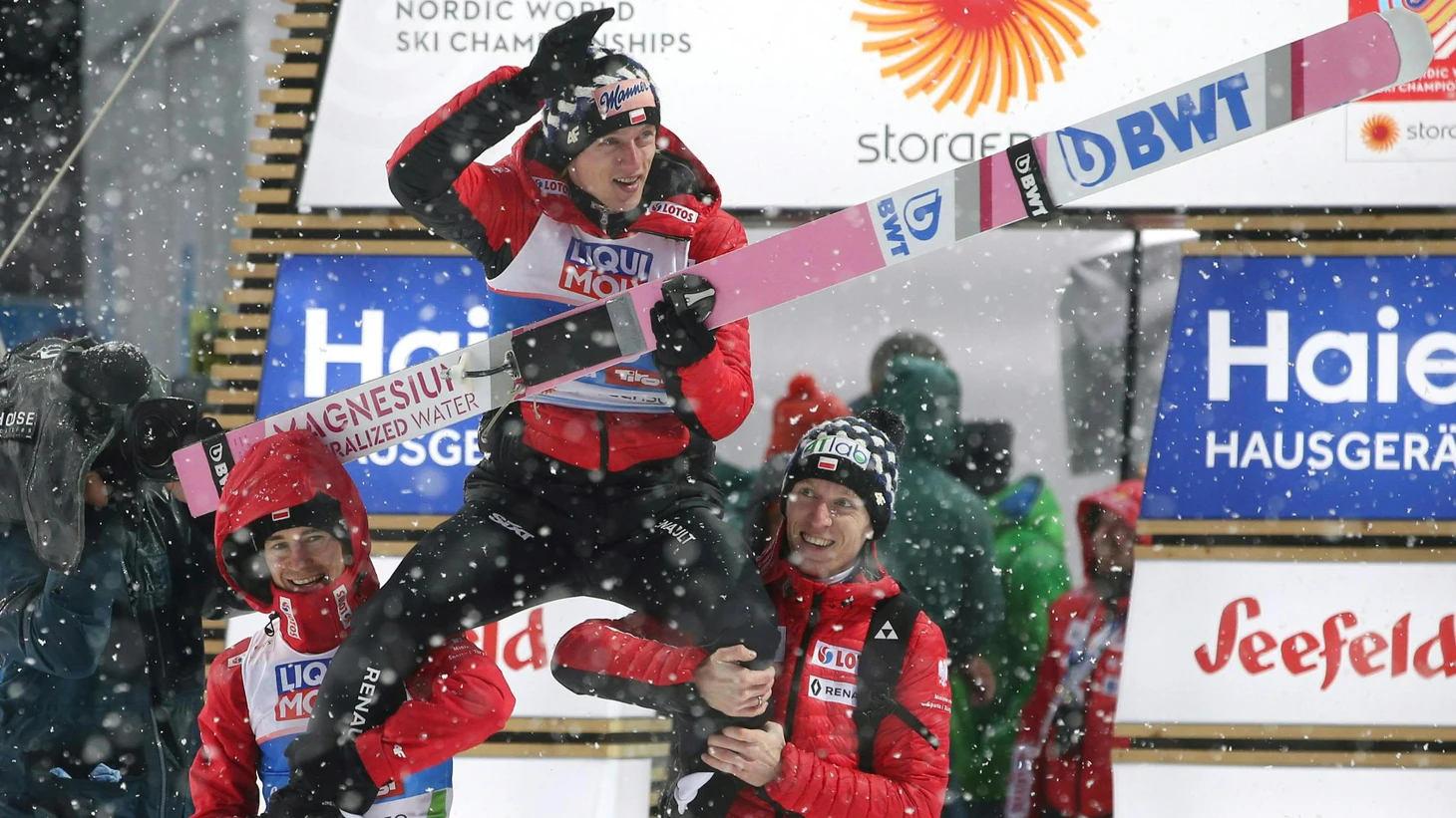 Если с Маркусом Айзенбихлером в Инсбруке на первой неделе чемпионата мы уже разобрались, то что произошло в самом Зеефельде, кажется, не понял вообще ни один участник и свидетель соревнования. Жуткая погода, прыгающие стартовые ворота, полный кавардак в протоколах – и лидировавший после первой попытки Рюёю Кобаяши оказывается лишь 14-ым, а чемпионом становится Давид Кубацки, взлетевший с 27-го места. Второе место занял поднявшийся с 18-го места Камил Стох. Третье – Крафт, бывший десятым. «После первого раунда я сказал себе: окей, спасибо, снова без медалей», – попытался описать развитие событий польский тренер Штефан Хорнгахер. То, что случилось потом, словами описать сложно. Поэтому просто посмотрите на эмоции сдержанного обычно Кубацки, когда он подбирает выражения для интервью.