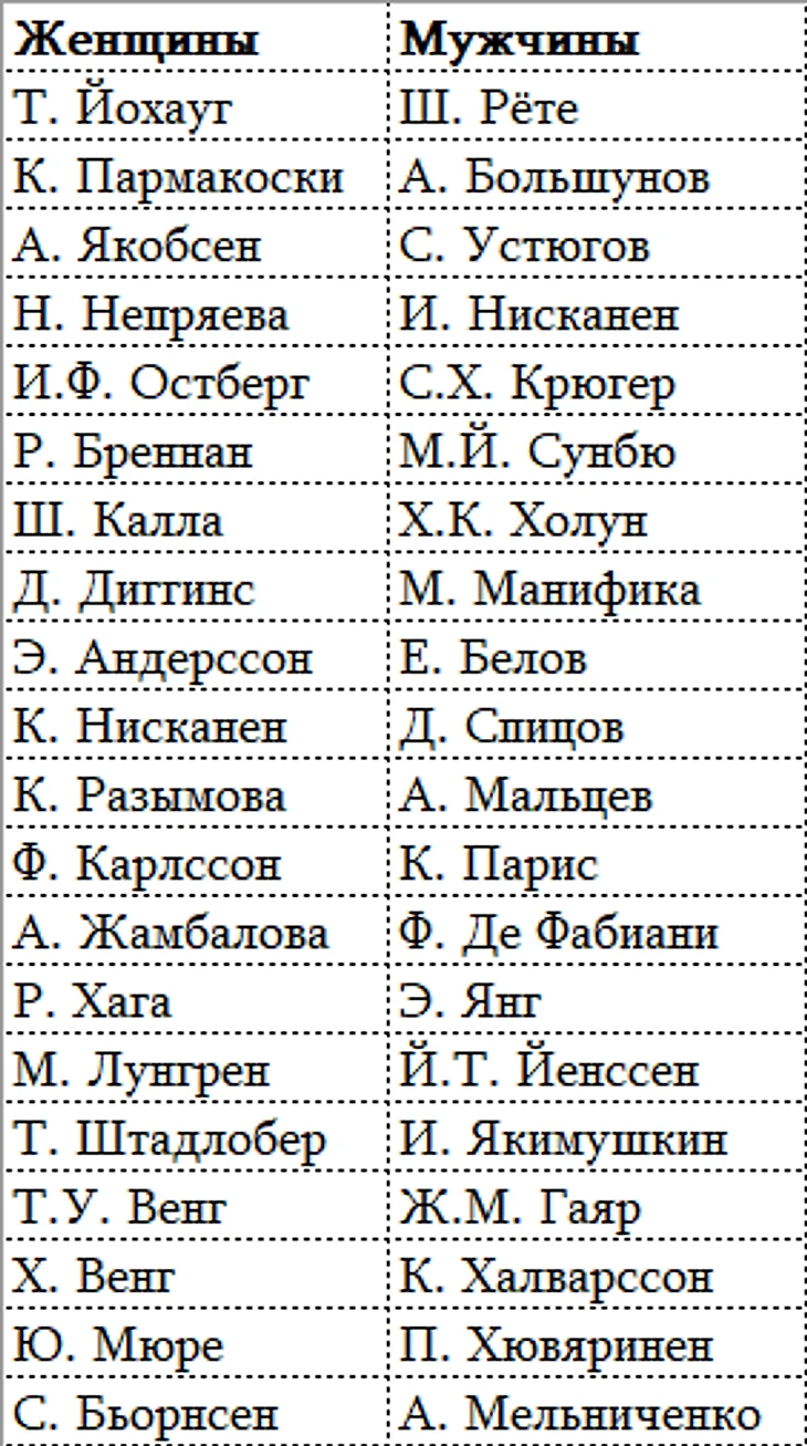 1. Йохауг 1-3. Остберг 1-6. Непряева