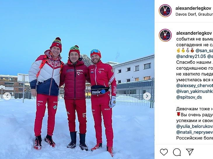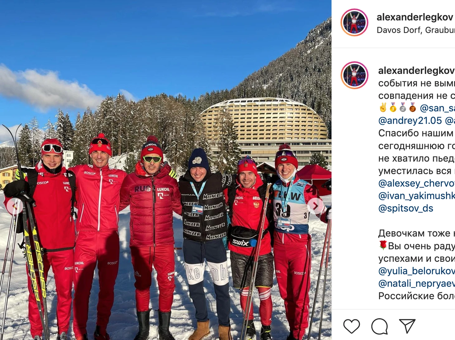 В инстаграмме Легкова были выложены фотографии членов сборной, наших топовых лыжников (Большунова, Мальцева, Белова) в обнимку с неизвестным.