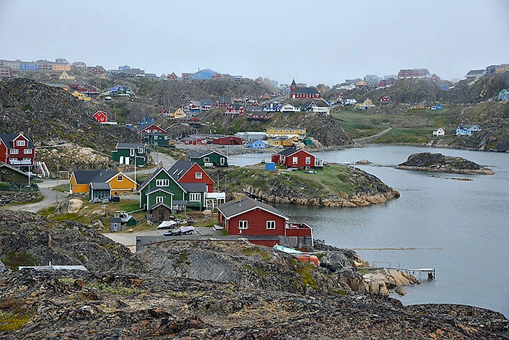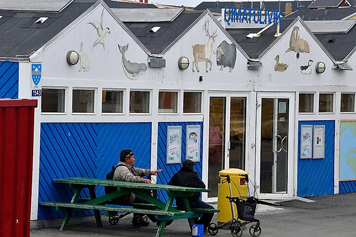 Поселок Сисимиут, что переводится с инуитского как «лисья нора», расположен на западном побережье острова. Сверху, как все гренландские поселения, он похож на горстку разноцветных кубиков «Лего», брошенных на заснеженные берега фьорда: повсюду в Арктике дома красят во все возможные цвета, стараясь оживить пустынные пейзажи; рядом был порт, где у причалов стояли обледеневшие траулеры.